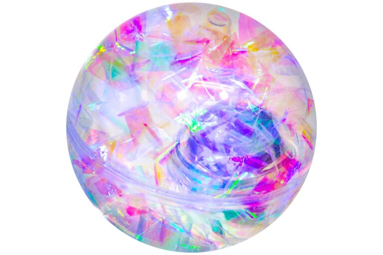 Når den hopper eller rystes lyser den kraftigt op med et vælg af flotte farver blandet med glimmer.