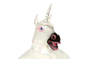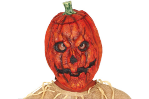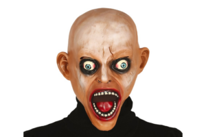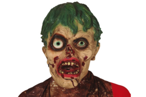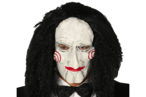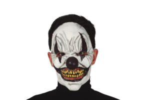 Scary smilende klovnemaske i gummi med sort hovedbelædning i stof