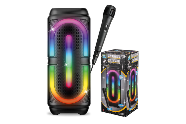 Med 2×10 Watt og 2×4″ (10 cm) basenheder får du klar lyd og solid bund, uanset om du synger, spiller musik eller ser film. Højttaleren har indbygget lydaktiveret LED-lys, der skifter farve i takt med musikken og skaber ægte feststemning.
