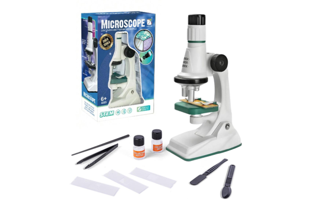 Bemærk, at mikroskopet bruger 2 AA-batterier, som ikke følger med. Hvis du vil i gang med det samme, er det en god idé at have batterier klar. Når batterierne er sat i, er du klar til at gå på opdagelse i en verden, du normalt ikke kan se med det blotte øje.
