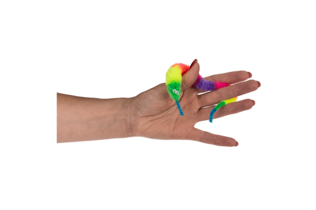 Ormen er lavet i blødt, farverigt materiale, og regnbuemønstret giver den et ekstra livligt og sjovt look. Den glider let mellem fingrene, og den usynlige snor er både diskret og stærk nok til at lave mange forskellige tricks.