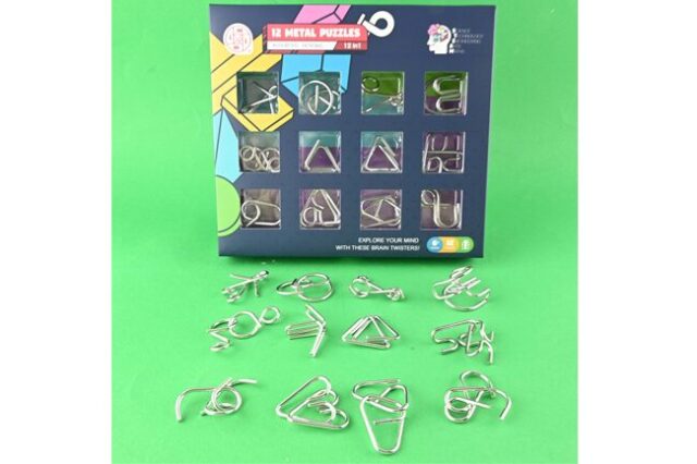 Udfordr hjernen med 12 forskellige metalpuslespil i ét sæt. Perfekt til at træne logik, tålmodighed og problemløsning