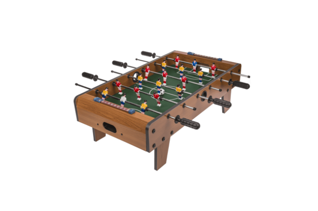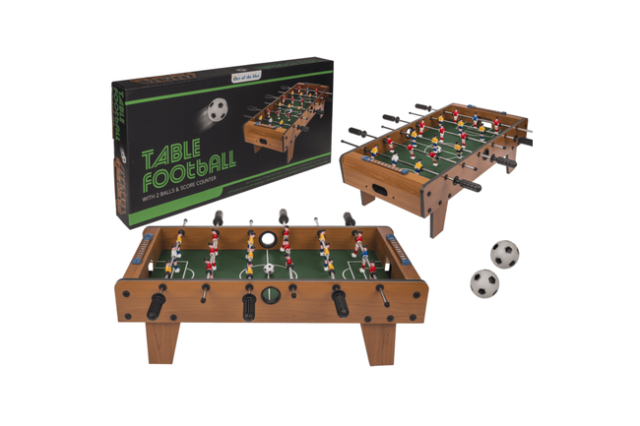 Denne mini bordfodboldbane i træ giver hurtig, sjov og klassisk underholdning i et kompakt format. Den er perfekt til værelset, kontoret, sommerhuset eller enhver plads, hvor man vil have en pause fyldt med energi og konkurrence. Bordet måler ca. 69 x 36,5 x 24 cm, så det er stort nok til gode kampe, men lille nok til at flytte eller opbevare uden problemer.
