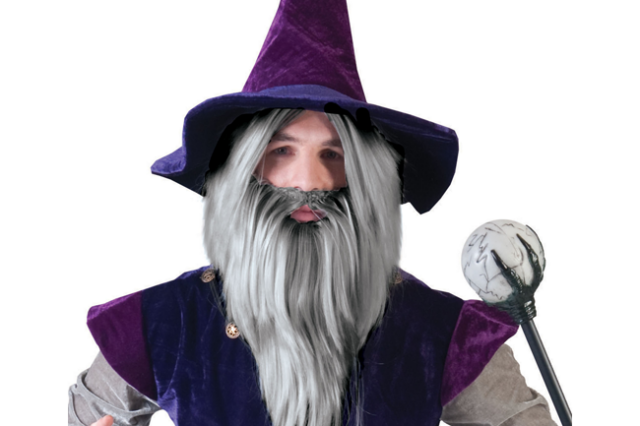 Træd ind i en verden af magi og mystik med dette komplette sæt bestående af en lang, bølget paryk og en matchende fuldskæg.