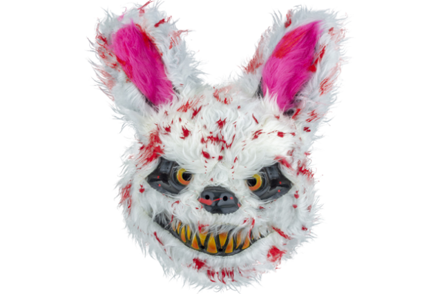 Masken kombinerer det søde med det skræmmende – hvid pels, lange ører og et fordrejet, blodigt grin. Perfekt til halloween, maskerade og horror-events.