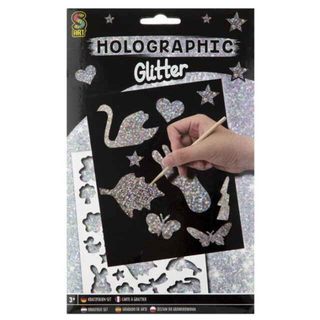 Denne flotte kradsebog med glitter eller regnbuefarver er perfekt til nysgerrige og fantasifulde børn. Med den medfølgende kradsepen kan de skrabe mønstre, figurer eller små beskeder frem på de fire A5-ark, hvor der under den mørke overflade gemmer sig et farverigt univers.