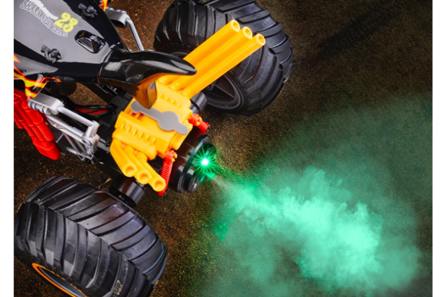 Med sin vilde hajfinnedesign og røgfyldte dæk er den et hit til både børn og voksne, der elsker fart og sjove effekter.