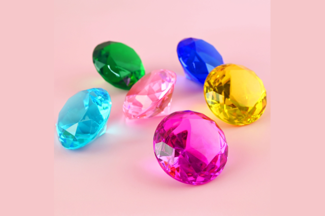 Farverige plastdiamanter til pynt, leg og kreative projekter