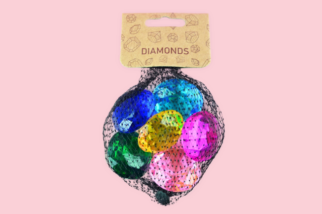 Dette net indeholder seks flotte plastdiamanter i klare og livlige farver: cyan, blå, gul, grøn, lilla og pink. Hver diamant har en smuk facetteret overflade, som fanger lyset og giver et glitrende udtryk. De er lette, holdbare og perfekte til både dekoration, pynt og fantasifuld leg.