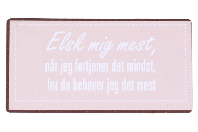 - Magnet med teksten “Elsk mig mest, når jeg fortjener det mindst…”