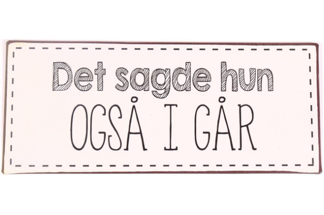 Det sagde hun også i går (Metal Skilt) er en enkel måde at give dit rum mere personlighed. Skiltet har en klassisk, fræk punchline, som de fleste fanger med det samme. Det gør det til en oplagt detalje, når du vil skabe en afslappet stemning. Du bestemmer selv, om det skal hænge diskret i et hjørne, eller have en central plads.