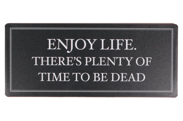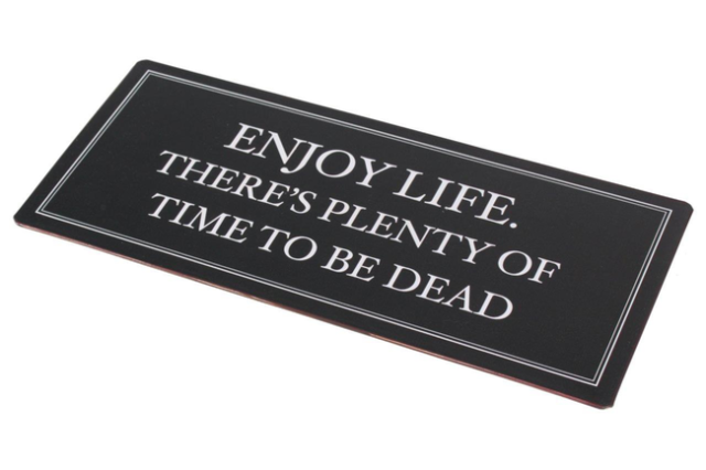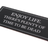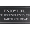 Enjoy life. There’s plenty of time to be dead – metal skilt med et citat, der bliver hængende