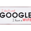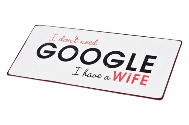 - Humoristisk metal skilt med teksten “I don’t need google, i have a wife”