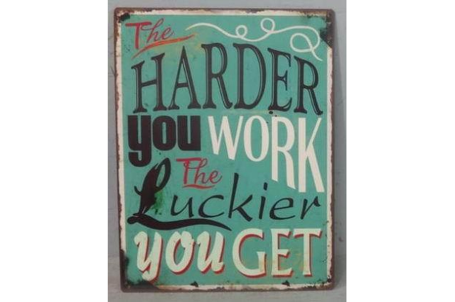 The harder you work, the luckier you get (Metal Skilt) – et citat, der passer til hverdagen
