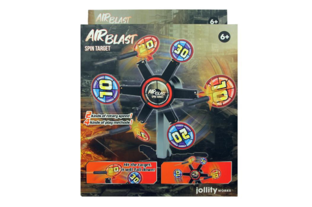 Airblast Spin Target gør skydetræning til en leg! Det seje skydemål har seks roterende arme, der kan skydes ned, og du kan vælge mellem to rotationshastigheder og fire forskellige spilmåder.