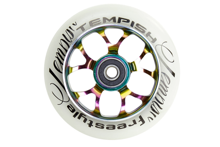 Solid hjul til trickløbehjul med kraftigt gummidæk og aluminiums fælg med rainbow belægning.