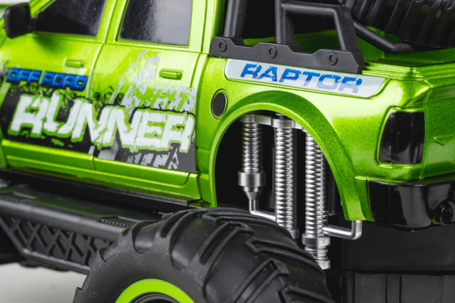 Raptor Runner er bygget til at holde. Dens stødsikre karrosseri og fleksible affjedring gør den ideel til ujævnt terræn og høj fart. Dækkene er designet med groft mønster for at give maksimalt greb – selv på løst underlag.