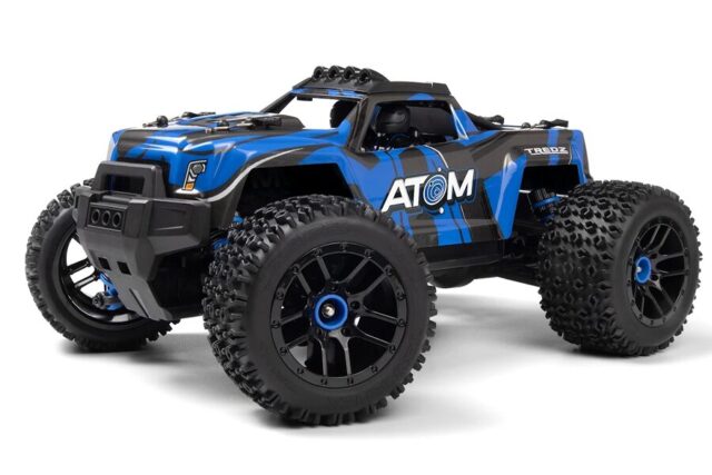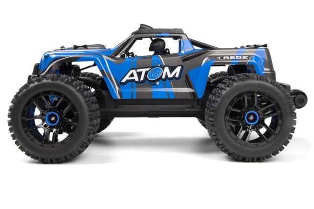 ATOM’en har et robust karrosseri med burforstærkning og unikt trykt design – og fås i flere fede farver. Denne blå version leveres med farvekoordinerede støddæmpere, motorkøler og hjulkapsler for et sejt og sammenhængende look.