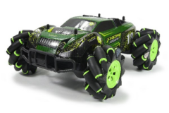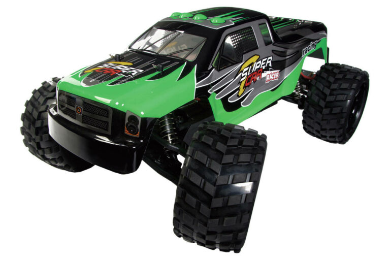Stor sej hurtigkørende RC monstertruck med brede dæk og lange støddæmpere der gør den velegnet til at køre i grus og på græs.