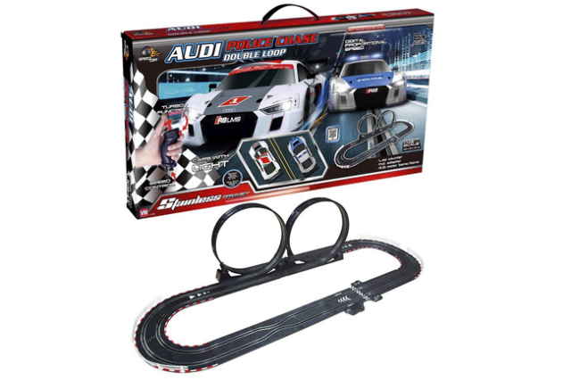 Sættet indeholder to Audi R8-biler i skala 1:43 – begge med lys, der giver ekstra realisme på banen.