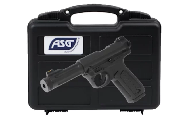 ASG-kufferten er lavet i ridsefrit plast med praktisk håndtag. Indvendigt findes plukskum/æggebakkeskum og polstring, så pistol og tilbehør kan fastgøres sikkert under transport. Kufferten rummer pistol, ekstra magasin og småting.