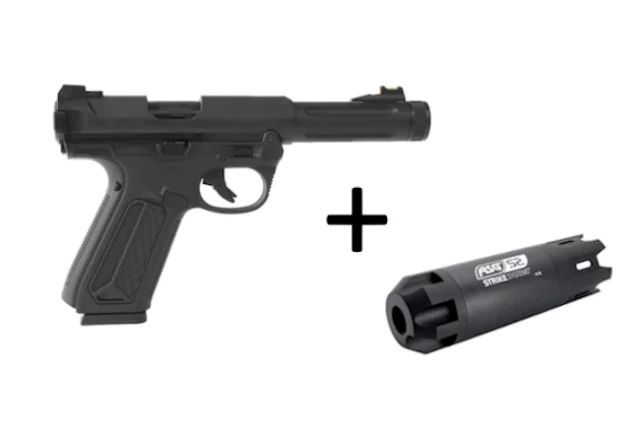 Bundle med ActionArmy AAP01 Assassin GBB-pistol og STRIKE SYSTEMS CTU-XL tracer-enhed. AAP01 er en Glock-stil gaspistol i glasfiberforstærket polymer, kun 231 g uden magasin, og kompatibel med standard Glock-magasiner. Et railsæt medfølger til montering af lygte eller laser. Pistolen har 14 mm CCW-gevind, hvilket gør den klar til lyddæmper eller tracer.