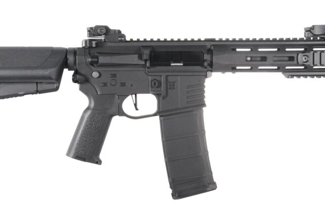 Kolben er ergonomisk designet og giver både godt greb og nem adgang til batteriet – noget der normalt kun ses på dyrere rifler.