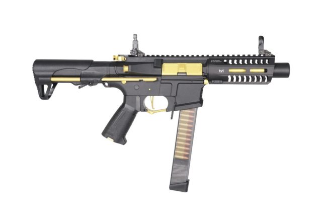 Kompakt elektrisk airsoft våben fra G&G i Taiwan med en længde på kun 50 cm (kolbe slået ud 59.5 cm)