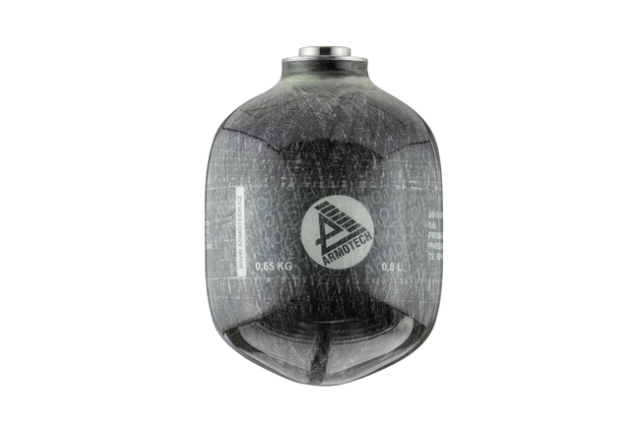 Flasken har en kapacitet på 0,8 liter og er fremstillet som en kompositcylinder med Kevlar-laminering og bund i rustfrit stål, hvilket giver en stærk, robust og UV-resistent konstruktion. Materialet reducerer vægten markant sammenlignet med almindelige stålflasker, og med kun 800 gram er den nem at bære – selv under lange spil eller træningssessioner.