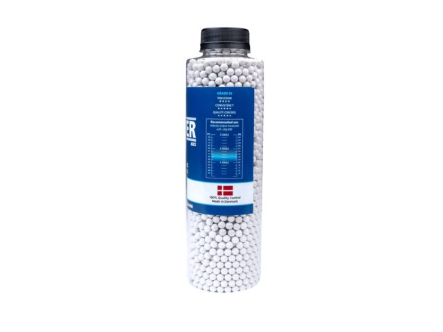 Flasken med ca. 3300 kugler (+/- 2 %) er praktisk til dosering og opbevaring. Skruelåget gør det nemt at hælde direkte i speedloaders eller magasiner uden spild. Den ikke-bionedbrydelige sammensætning betyder samtidig, at kuglerne bevarer form og flyveegenskaber over længere tid — en fordel for spillere, som køber i større mængder og gemmer rester til fremtidige spil.
