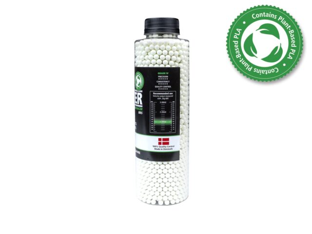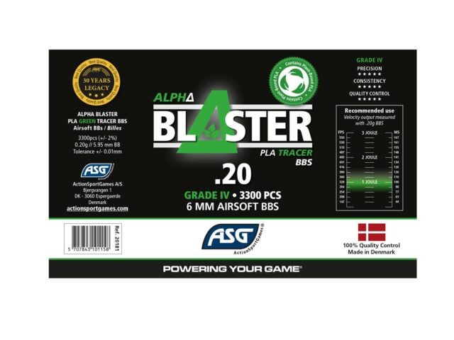 Alpha Blaster Tracer PLA BBs 0.20 g kombinerer miljøvenligt materiale med synlig tracer-effekt — perfekt til natlige øvelser eller sjov træning i svagt lys. Kuglerne indeholder PLA, en plantebaseret bioplast, der under påvirkning af fugt og ilt brydes hurtigere ned end almindelig plastik. De er desuden testet efter EU- og US-regler og er ikke-giftige.