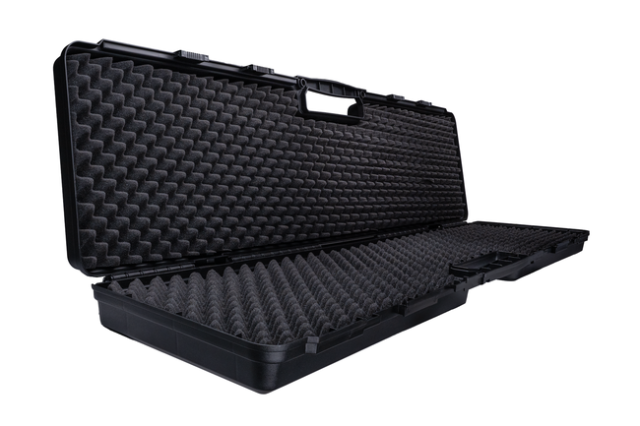Indvendigt finder du bølgeformet skum på begge sider. Det hjælper med at holde riflen stabil, beskytter mod stød og giver plads til ekstra udstyr som lyddæmpere, magasiner eller mindre tilbehørsdele. Skummet former sig let omkring udstyret og mindsker bevægelse under transport.