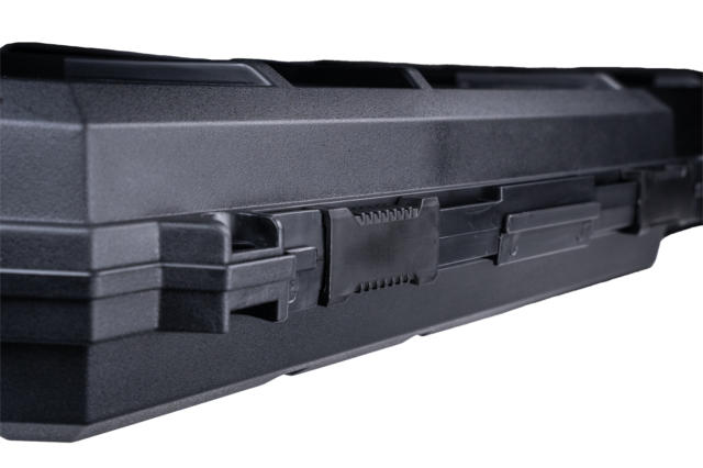 Fire kraftige skydeclips holder låget fastspændt under transport. Clipsene er nemme at betjene, men sidder stramt nok til at fastholde kassen selv ved hård håndtering. Du finder også to forstærkede øjer til hængelåse, så du kan sikre våbnet ekstra effektivt. Det gør især en forskel, hvis du transporterer værdifuldt udstyr eller rejser med flere rifle cases i samme bil.