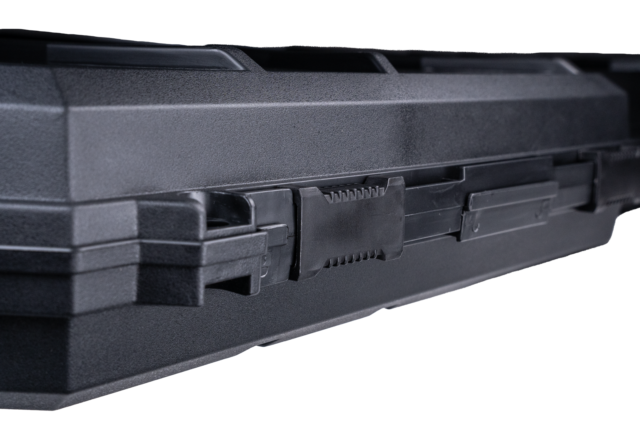 Indvendigt finder du bølgeformet skum på begge sider. Skummet beskytter riflen mod stød og bevægelse under transport. Det tilpasser sig udstyret uden behov for justering. Riflen ligger stabilt, selv på ujævne underlag. Skummet fungerer til mange våbentyper og ekstraudstyr.