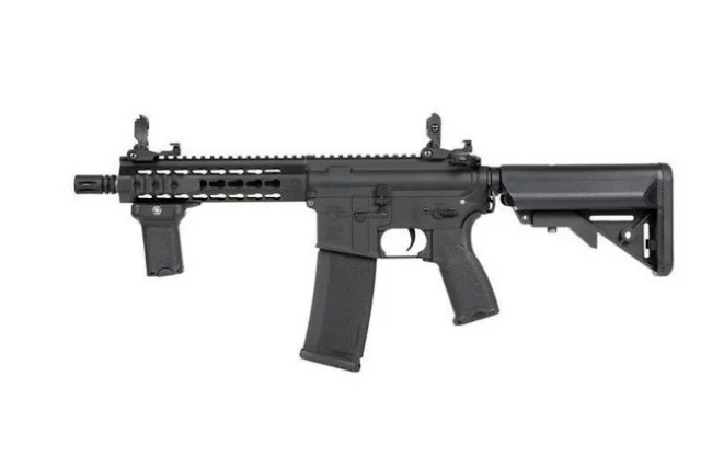 RIS B5 short grip er et kompakt greb i stærk polyamide (PA66). Det er designet til montering på 22 mm RIS/Picatinny rail og giver et fast og stabilt greb. Materialet er både slidstærkt og let, hvilket gør grebet velegnet til hårdt spil uden at tilføje unødvendig vægt.