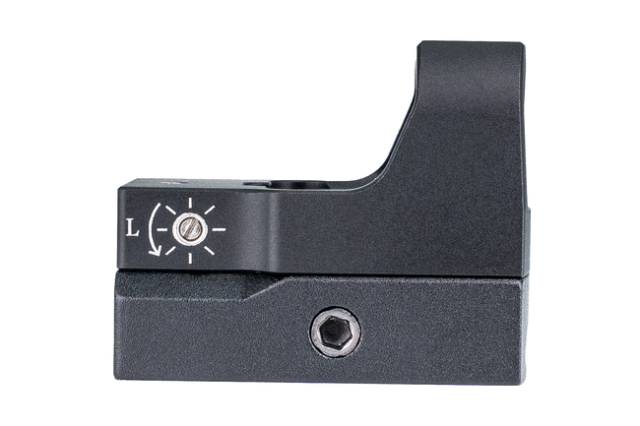 Den røde prik er på 3,5 MOA, hvilket giver en god balance mellem præcision og synlighed. Prikken er lille nok til at du kan placere den kontrolleret, men stadig tydelig nok til hurtig opretning. Du kan justere lysstyrken i seks trin, så du kan tilpasse prikken til omgivelserne. Det er praktisk, når du skifter mellem udendørs dagslys og mørkere indendørs baner.