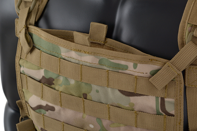 Chest riggen har justerbare stropper, så pasformen nemt kan tilpasses din krop. Den sidder stabilt uden at begrænse bevægelse af arme eller overkrop. Konstruktionen er let, men robust, hvilket gør vesten velegnet til lange spil og intensiv brug. Multicam-farven giver effektiv camouflage i mange typer terræn.
