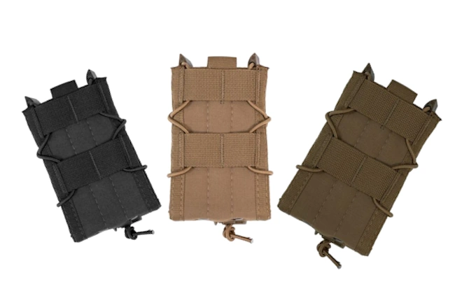 Pouch’ens design kombinerer praktisk funktion og robust konstruktion. En quick-release spænde gør den nem at fastgøre og fjerne fra MOLLE-paneler, battle belts eller tasker. Den elastiske åbning holder magasinet stramt og sikrer samtidig hurtig trækudtag ved omladning. På begge sider er pouchen forstærket med polymerindlæg, som giver ekstra stabilitet og forebygger deformation, også ved hyppig brug.