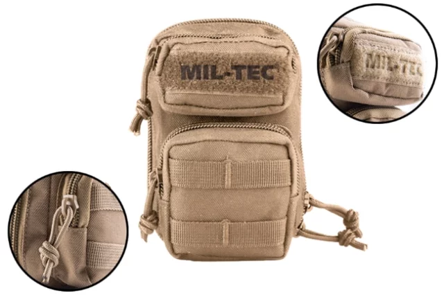 Tasken har tre små lynlåsrum, perfekte til mønter, nøgler eller små genstande, du vil have samlet ét sted. På forsiden sidder et velcropanel med Mil-Tec-logo, der giver et taktisk præg.