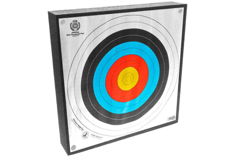 I denne pakke får du også 10 kvalitets skydeskiver i 40x40cm (lidt mindre end på billedet) og 4 pins til at sætte dem fast på skumskiven.