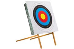 I denne komplet pakke får du også 5 store 60 x 60 cm kvalitets skydeskiver i ekstra krafigt papir og 4 pins til at sætte dem fast på skumskiven.