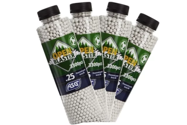 Bundle med 4 flasker bio BB’er á 3300 stk. (0,25 g) – i alt 13.200 kugler. Fremstillet i PLA, et miljøvenligt materiale fra majsstivelse eller sukkerrør, som nedbrydes naturligt i fugtige omgivelser. Kuglerne er sikre, testet efter EU- og amerikanske standarder og fri for giftstoffer.